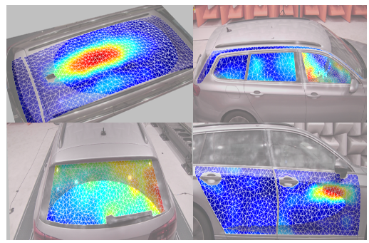 Vibration scanning was performed at 25 km/h car speed. Main cabin elements related to the car interior were scanned as shown in Figure below (roof, side windows, back window, side doors).
