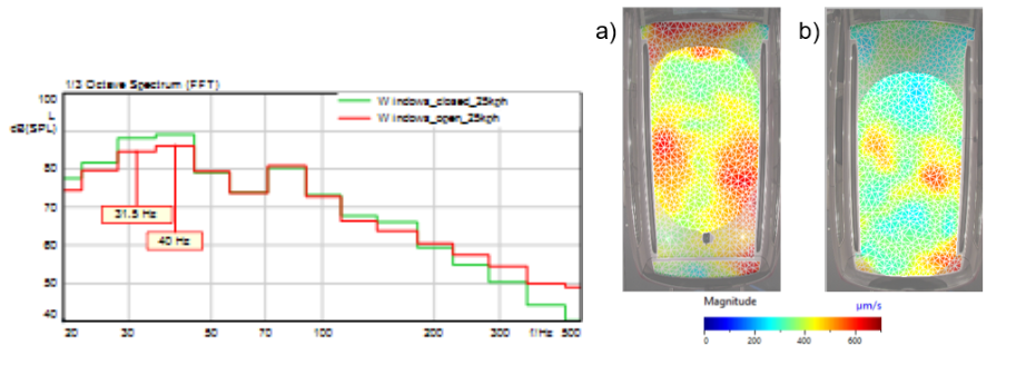 Figure below shows the difference in rooftop vibration velocity average spectrum with all windows closed and open. The biggest difference can be noticed in the mentioned 40 Hz frequency. This suggests that indeed the stiffness of air filling the cabin plays an essential role in forming this global mode.