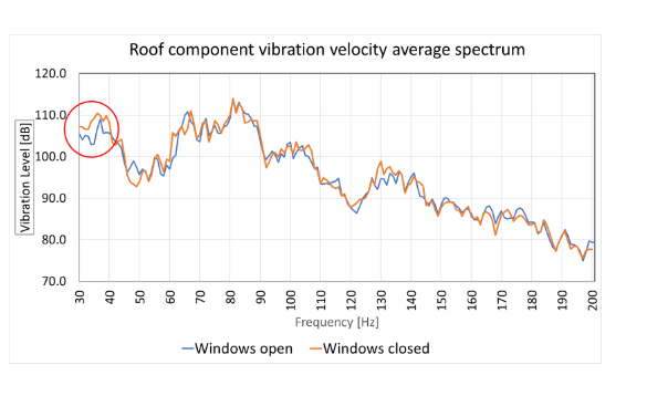 Measurements show that opening windows causes a significant sound level drop and vibration magnitude drop (Figure below) at the 40 Hz frequency band.