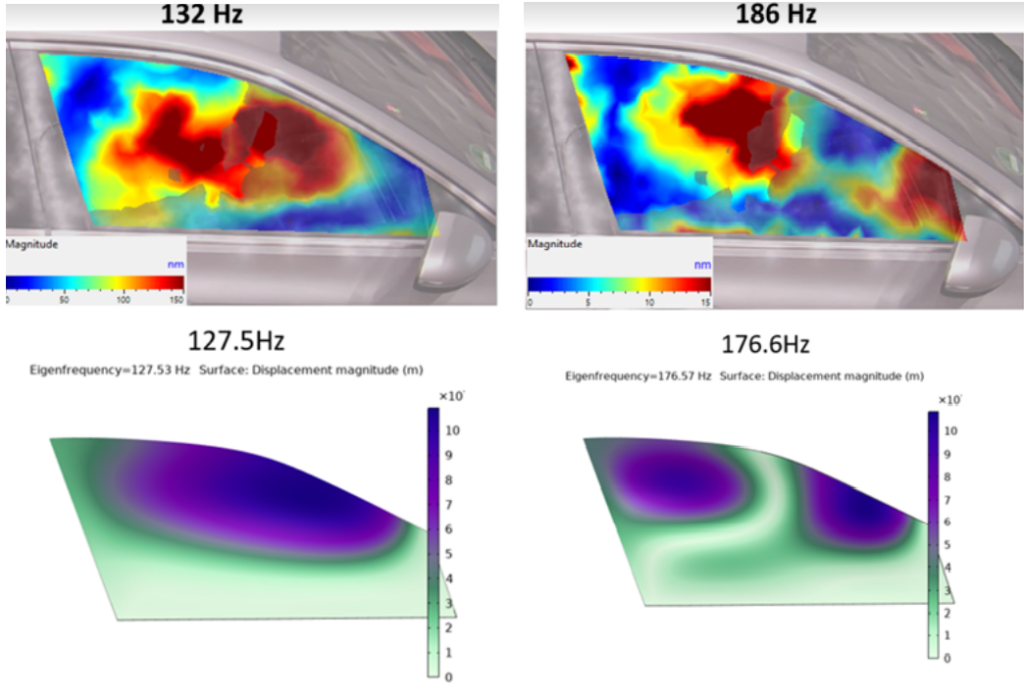 These global modes can be attributed to either the overall structural assembly of the car or the coupling of the structural assembly with the acoustic system inside the cabin. In the latter scenario, the car undergoes the well-recognized mass-spring resonance, where the air inside the cabin assumes the role of a spring, introducing stiffness. This phenomenon remains elusive when measuring individual car parts in isolation, underscoring the clear advantage of integrating the 3D laser vibrometer and acoustic dynamometer. This combination allows for a holistic scan of the entire car’s vibrations without the need to dissect the car structure during simulated driving conditions. Conversely, when issues arise at higher frequencies, the identification of local modes in individual parts becomes more accessible through the analysis of measured mode shapes.
