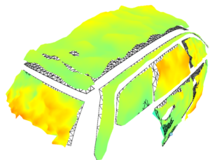 Based on the measurements it can be found that at 81 Hz the structural mode of the roof can be easily recognized. But for 36 Hz the whole roof surface vibrates in phase (Figure above ). For deeper understanding of this phenomena, a whole car cabin behaviour at this frequency vibration is presented on the 3D model (Figure Below). It can be seen from the figure below that each cabin element exhibits the same pumping motion. This vibration pattern can be associated with a global mode of the cabin.